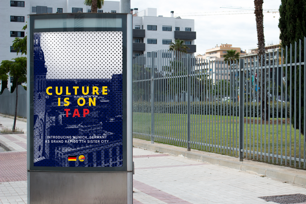 Grand Rapids introduces its seventh sister city, Munich, Germany, through a visual campaign that uses various digital and physical mediums. The billboard is designed with iconic landmarks from both cities and the Instagram ad targets a younger audience. A bus stop kiosk engages commuters. The magazine spread delves into the cultural exchange, providing insight into the partnership. Also, a limited-edition beer inspired by both cities’ brewing traditions is introduced to add to this unique campaign. This campaign encapsulates the essence of the Munich-Grand Rapids connection, fostering unity and cultural appreciation across the community.